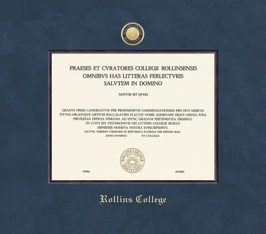Rollins College Diploma Frame with Medallion and Navy Blue Suede and Wood Fillet Double Mat and Gold Embossing