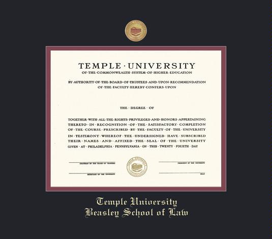 Temple University Diploma - Beasley Law Frame (1/09-2022_with Colored Medallion and Black and Maroon Double Mat and Gold Embossing