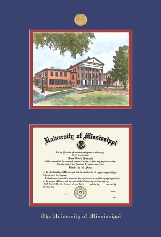 University of Mississippi Diploma and Lithograph Frame with Medallion and Royal Blue and Red Double Mat and Gold Embossing