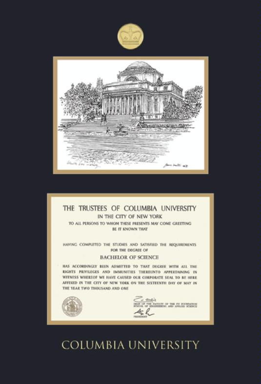 Columbia University Diploma - BA/MA (6/19 to Present) and Litho Frame with Medallion and Black and Gold Double Mat and Gold Embossing