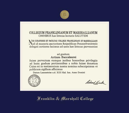 Franklin & Marshall College Diploma Frame with Medallion and Navy Blue and Cream Double Mat and Gold Embossing