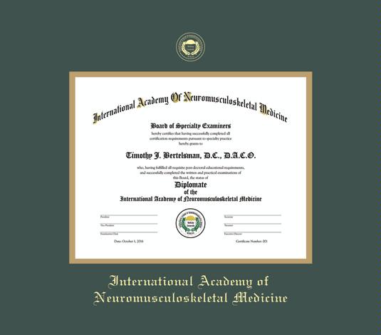 International Academy of Neuromusculosketal Medicine Certificate Frame with Green and Gold Double Mat and Gold Embossing