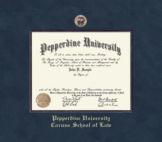 Pepperdine University Diploma - Law (2020 to Present) Frame with Colored Medallion and Navy Blue Suede and Wood Fillet Double Mat and Gold Embossing