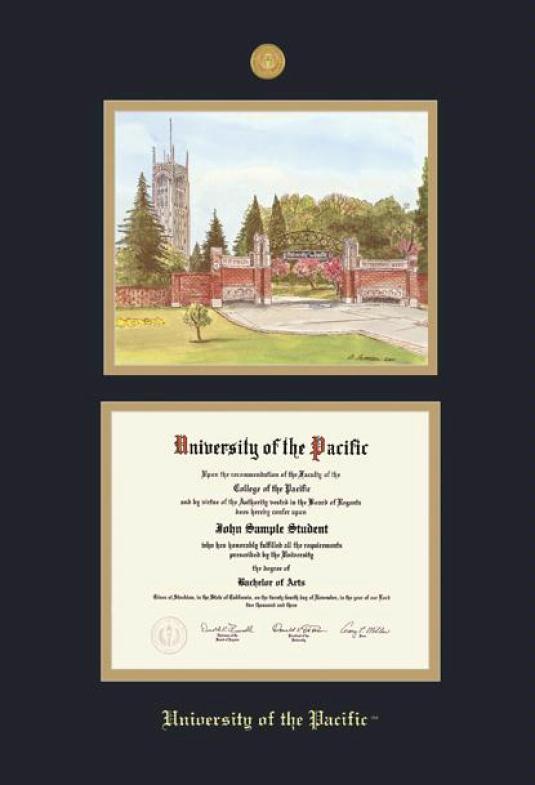 University of the Pacific Diploma - BA/MA (8/03 to Present) and (8.5 x 11) Lithograph Frame with Medallion and Black and Gold Double Mat and Gold Embossing