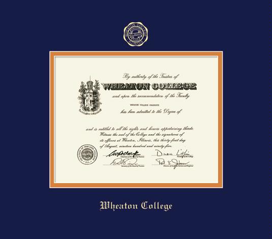 Wheaton College in Illinois Diploma - BA/MA (2020 to Present) Frame with Navy Blue and Orange Double Mat and Gold Embossing