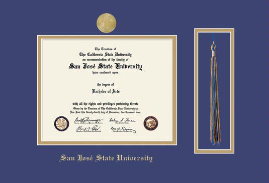San Jose State University Diploma Frame with Gold Medallion and Tassel Cut-out and Royal Blue and Gold Double Mat and Gold Embossing
