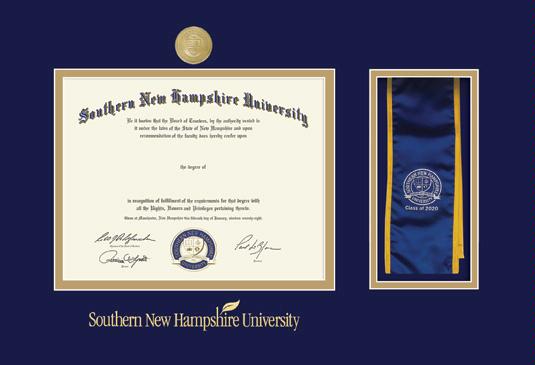 Southern New Hampshire University Diploma - BA/MA (2/18 to 8/22) Frame with Gold Medallion and Stole Opening and Navy Blue and Gold Double Mat and Gold Embossing