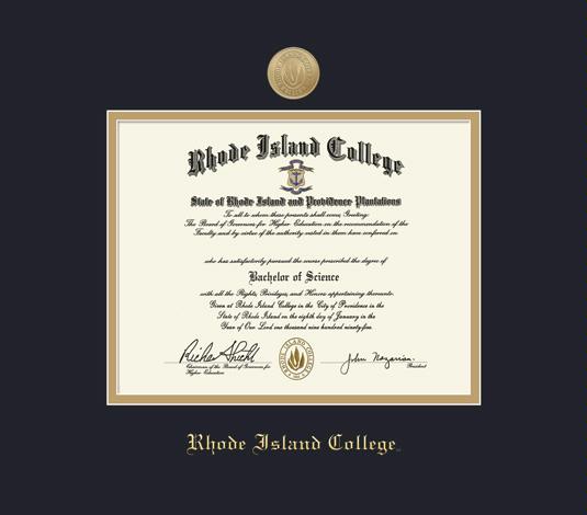 Rhode Island College Diploma (2/16 to Present) Frame with Medallion and Black and Gold Double Mat and Gold Embossing