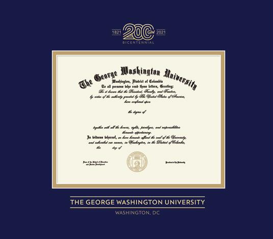 George Washington University Diploma - BA/MA (2021 Grads) Frame with Navy Blue and Gold Bicentennial Mat and Gold Embossing