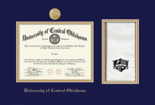 University of Central Oklahoma Diploma Frame with Medallion and Stole Cut-out and Navy Blue and Gold Double Mat and Gold Embossing