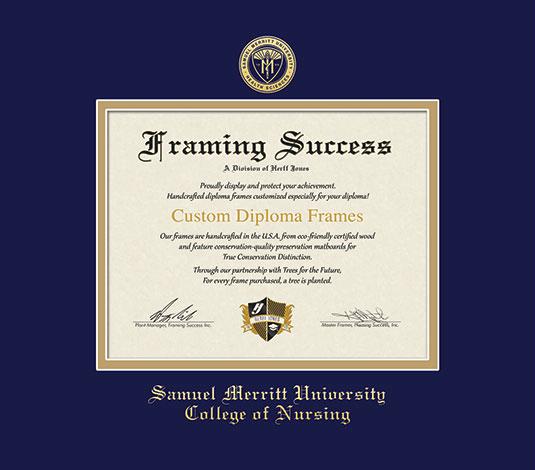 Samuel Merritt University Diploma - Nursing (7/22 to Present) Frame with Navy Blue and Gold Double Mat and Gold Embossing