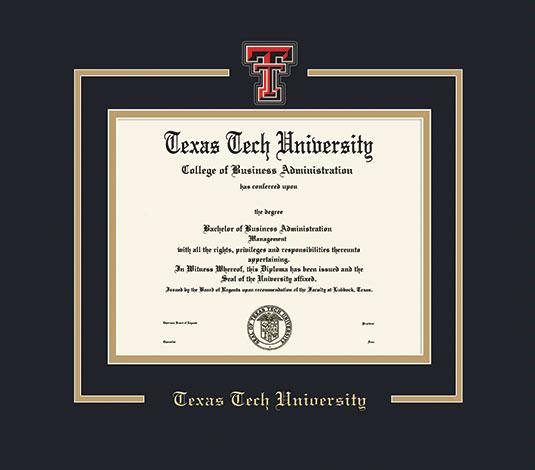 Texas Tech University Diploma - BA/MA/Doc (7/17 to Present) Frame with Shaped Medallion and Black and Gold Double Mat and Gold Embossing