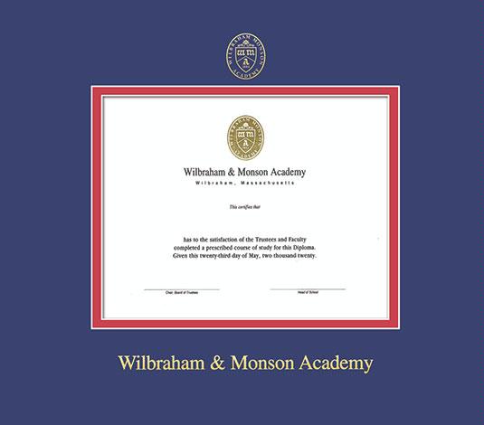 Wilbraham & Monson Academy Diploma (2021 to Present) Frame with Royal Blue and Red Double Mat and Gold Embossing