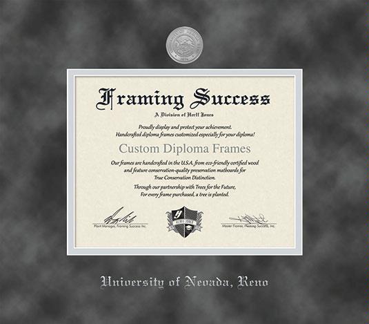 University of Nevada, Reno Diploma (Pre 4/22) Frame with Medallion and Grey Suede and Silver Double Mat and Silver Embossing