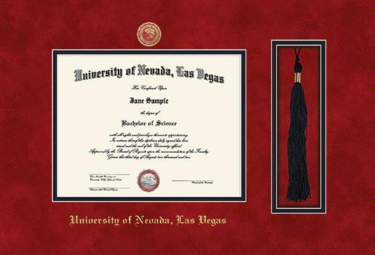 University of Nevada Las Vegas Diploma - BA/MA Frame with Medallion and Tassel Cut-out and Red Suede and Black Double Mat and Gold Embossing