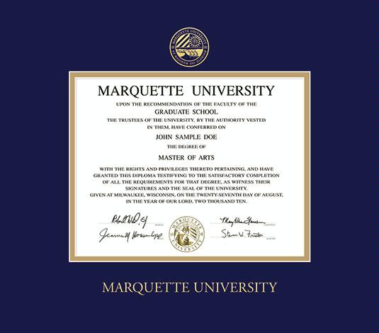 Marquette University Diploma (2022 to Present) Frame with Navy Blue and Gold Double Mat and Gold Embossing