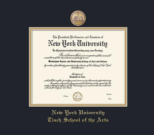 New York University Diploma - Arts (4/22 to Present) Frame with Medallion and Black and Gold Double Mat and Gold Embossing