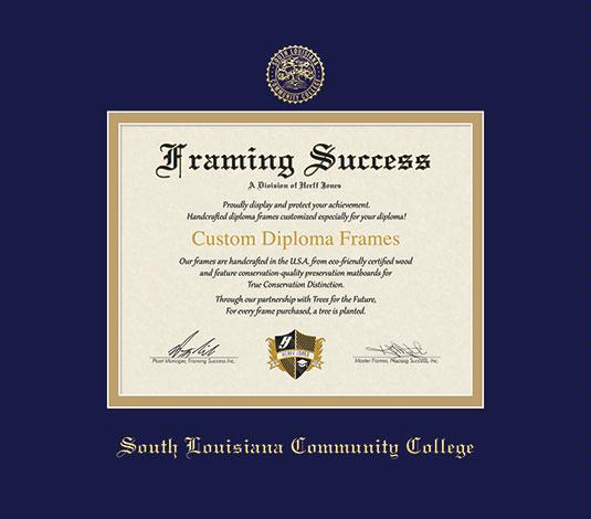 South Louisiana Community College Diploma (Pre 10/24) Frame with Navy Blue and Gold Double Mat and Gold Embossing