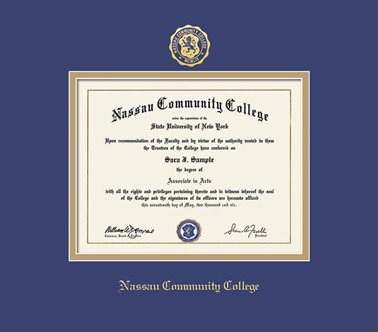 Nassau Community College Diploma Frame with Royal Blue and Gold Double Mat and Gold Embossing