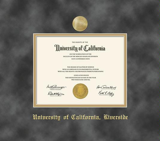 University of California- Riverside Diploma Frame with Medallion and Grey Suede and Gold Double Mat and Gold Embossing