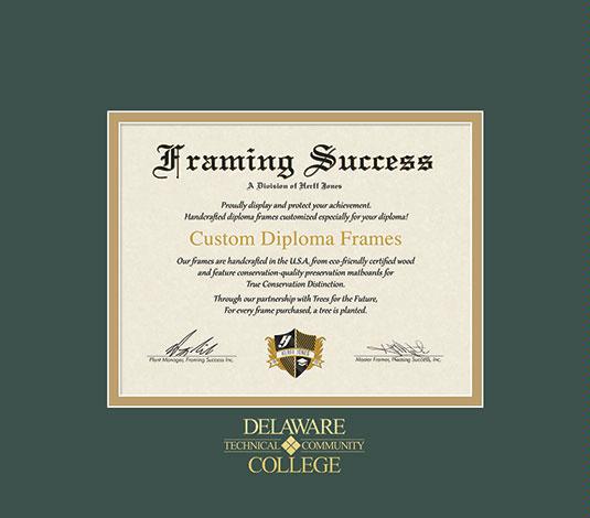 Delaware Technical Community College Diploma Frame with Green and Gold Double Mat and Gold Embossing