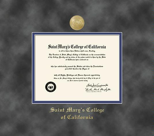 Saint Mary's College of California Diploma Frame with Medallion and Grey Suede and Royal Blue Double Mat and Gold Embossing