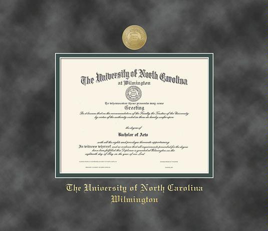 University of North Carolina-Wilmington Diploma Frame with Medallion and Grey Suede and Green Double Mat and Gold Embossing