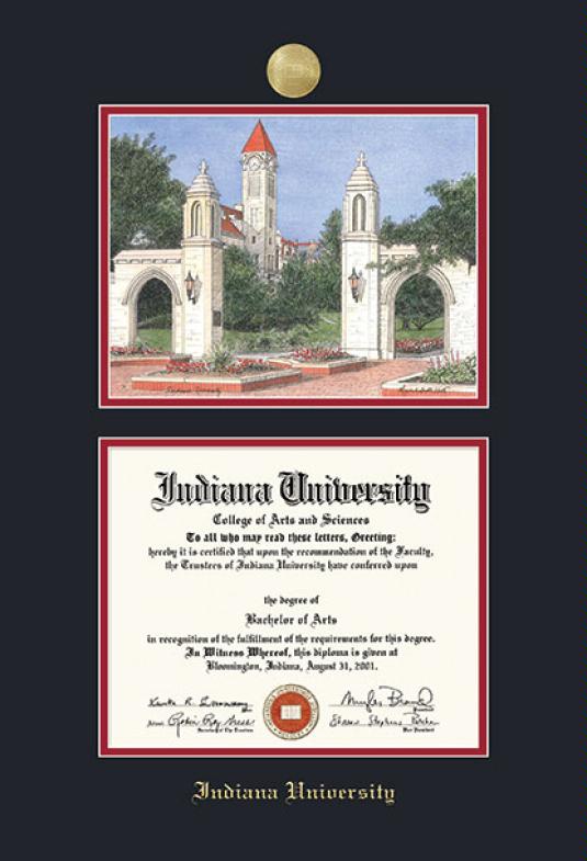 Indiana University Diploma - BA/MA/PhD (6/22 to Present) and Litho Frame with Medallion and Black and Red Double Mat and Gold Embossing