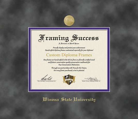 Winona State University Diploma Frame with Medallion and Grey Suede and Purple Double Mat and Gold Embossing
