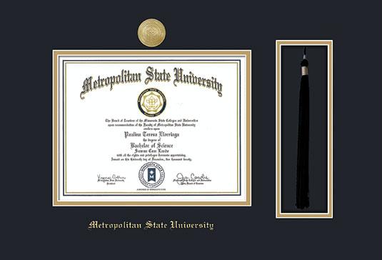 Metropolitan State University Diploma (8.5 x 11) Frame with Medallion and Tassel Cut-out and Black and Gold Double Mat and Gold Embossing