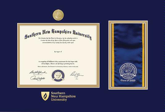 Southern New Hampshire University Diploma - BA/MA (9/22 to Present) Frame with Gold Medallion and Tassel Cut-out and Navy Blue and Gold Double Mat and Gold Embossing