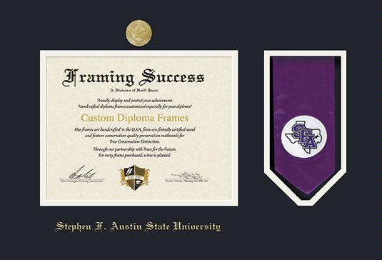 Stephen F. Austin State University Diploma Frame with Medallion and Stole Cut-out and Black and Cream Double Mat and Gold Embossing