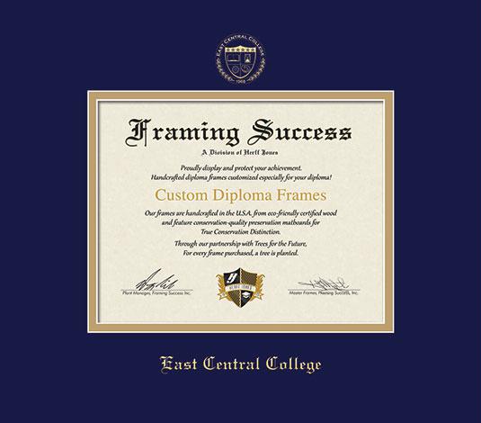East Central College Diploma Frame with Navy Blue and Gold Double Mat and Gold Embossing