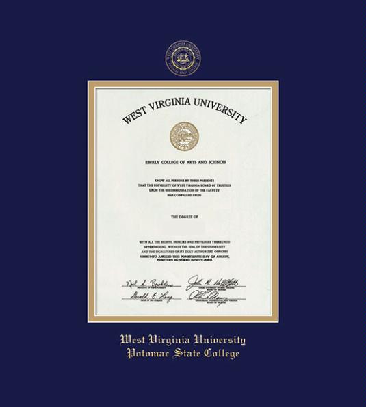 West Virginia University- Downtown Campus Diploma - BAS (12/22 to Present) Frame with Navy Blue and Gold Double Mat and Gold Embossing