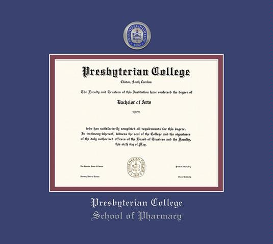 Presbyterian College School of Pharmacy Diploma Frame with Medallion and Royal Blue and Maroon Double Mat and Silver Embossing
