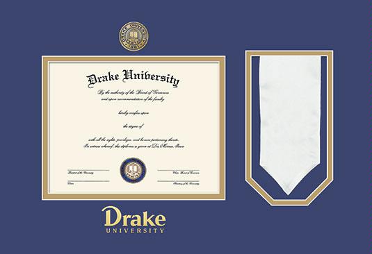 Drake University Diploma - BA/MA/PhD (9/23 to Present) Frame with Medallion and Stole Cut-out and Royal Blue and Gold Double Mat and Gold Embossing