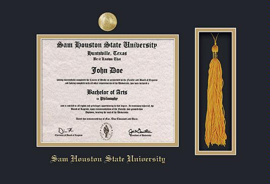 Sam Houston State University Diploma Frame with Medallion and Tassel Cut-out and Black and Gold Double Mat and Gold Embossing