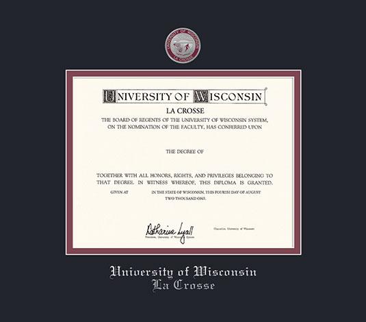 University of Wisconsin- La Crosse Diploma Frame with Colored Medallion and Black and Maroon Double Mat and Silver Embossing