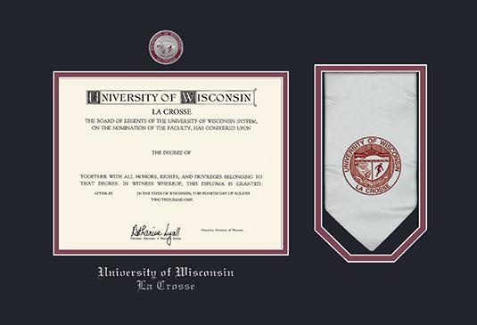 University of Wisconsin- La Crosse Diploma Frame with Colored Medallion and Stole Cut-out and Black and Maroon Double Mat and Silver Embossing