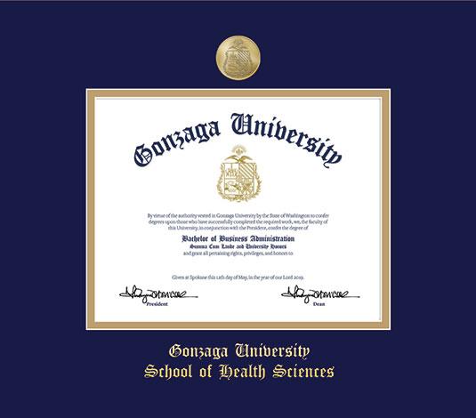 Gonzaga University Diploma - BA/MA Nursing (9/24 to Present) Frame with Medallion and Navy Blue and Gold Double Mat and Gold Embossing