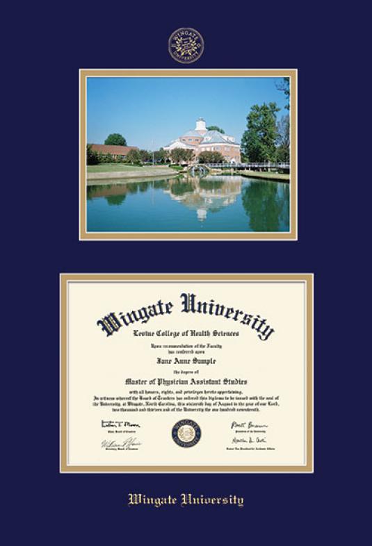 Wingate University Diploma - BA/MA/Doc (9/24 to Present) Frame and Photo with Navy Blue and Gold Double Mat and Gold Embossing