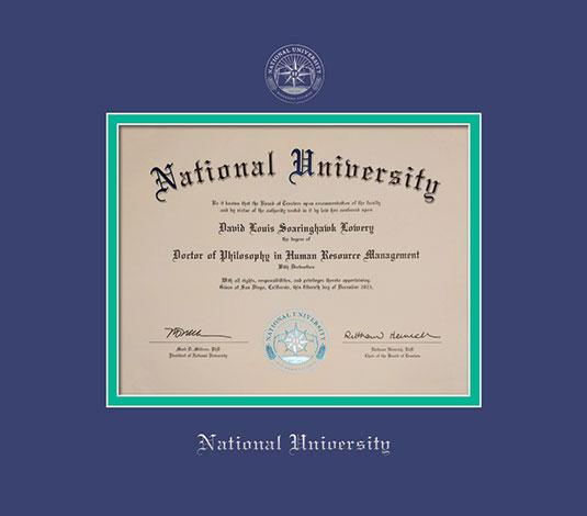 National University Diploma - Doctorate (2023 to Present) Frame with Royal Blue and Teal Double Mat and Silver Embossing
