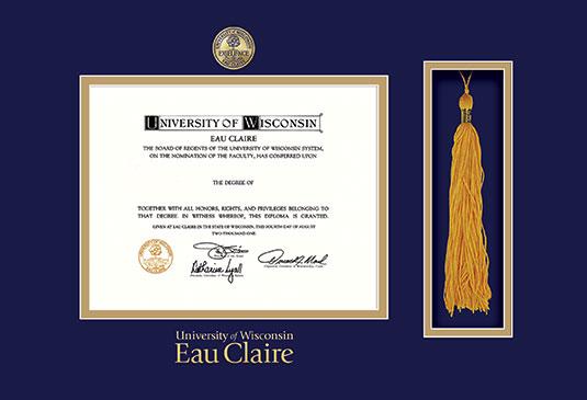 University of Wisconsin - Eau Claire Diploma (7/25 to Present) Frame with Medallion and Tassel Cut-out and Navy Blue and Gold Double Mat and Gold Embossing