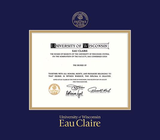University of Wisconsin - Eau Claire Diploma (7/25 to Present) Frame with Navy Blue and Gold Double Mat and Gold Embossing