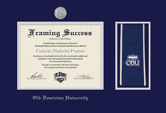 Old Dominion University Diploma Frame with Medallion and Stole Cut-out and Navy Blue and Silver Double Mat and Silver Embossing