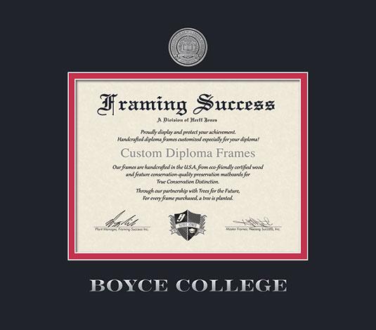 Boyce College Diploma Frame with Medallion and Black and Red Double Mat and Silver Embossing