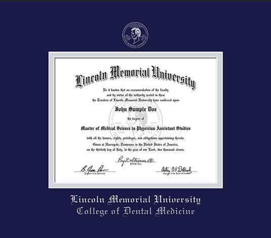 Lincoln Memorial University Diploma - College of Dental Medicine Frame with Navy Blue and Silver Double Mat and Silver Embossing