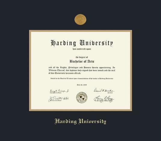 Harding University Diploma (2008 to Present) Frame with Medallion and Black and Gold Double Mat and Gold Embossing