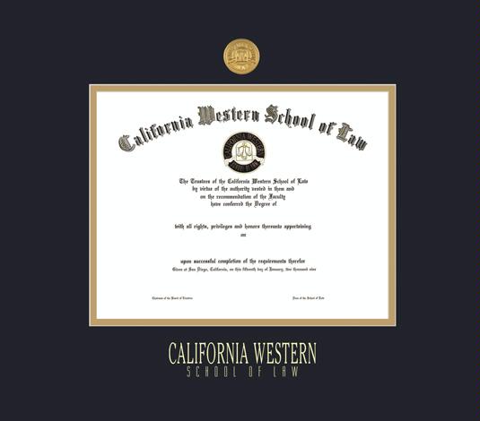 California Western School of Law Diploma Frame with Medallion, Black and Gold Double Mat, and Gold Embossing
