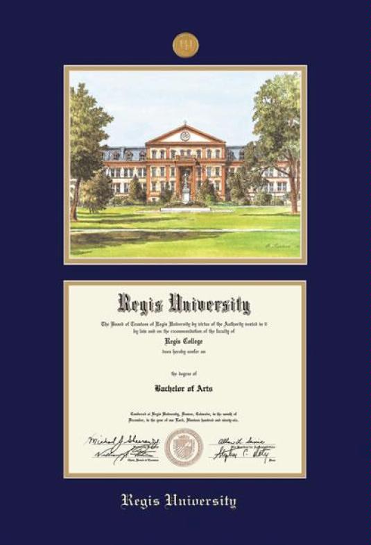 Regis University Diploma - BA/MA and Pre 1/12 Doc. and Lithograph Frame with Medallion and Navy Blue and Gold Double Mat and Gold Embossing